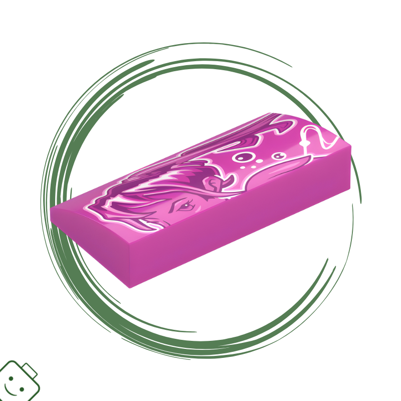 LEGO® dílek Slope, Curved 2 x 4 x 2/3 with Bottom Tubes with White, Magenta and Bright Pink Female Upper Face, Hair, Curved Lines and Dots Pattern Model Left Side / 88930pb199L