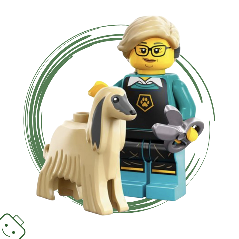 Vítej v LEGO® salonu pro čtyřnohé mazlíčky! Minifigurka Psí kadeřnice ze sběratelské 25. série (71045) je připravena na stylingovou misi. V ruce drží nůžky a fén, po boku jí stojí roztomilý pejsek – klient, který si zaslouží ten nejstylovější sestřih.