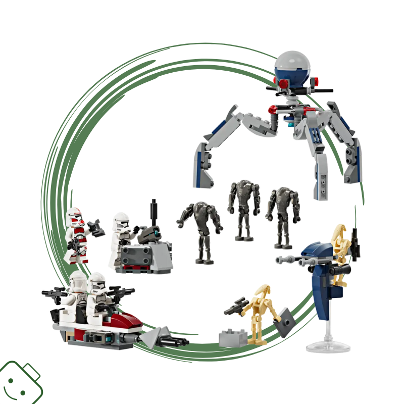 - Bitevní balíček klonovaného vojáka a bitevního droida pro děti – Připomeňte si scény ze seriálu Star Wars: Klonové války a přetvořte je do podoby z kostek LEGO® s figurkami LEGO, spídrovou motorkou a spoustou dalšího